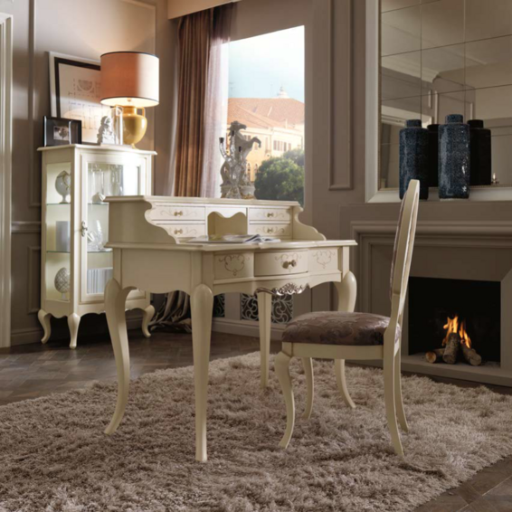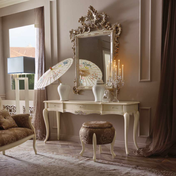 На этих крупных планах показаны роскошные инталии, украшающие элементы мебели, такие как великолепная рама зеркала. Дополняют картину консольный столик с тремя ящиками, пуф и мини-диван, обитые дамасской тканью.