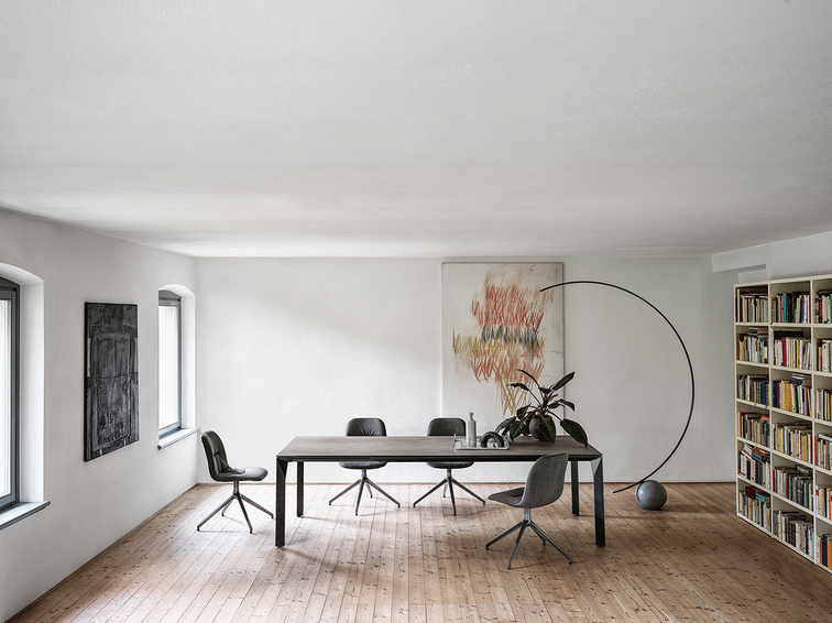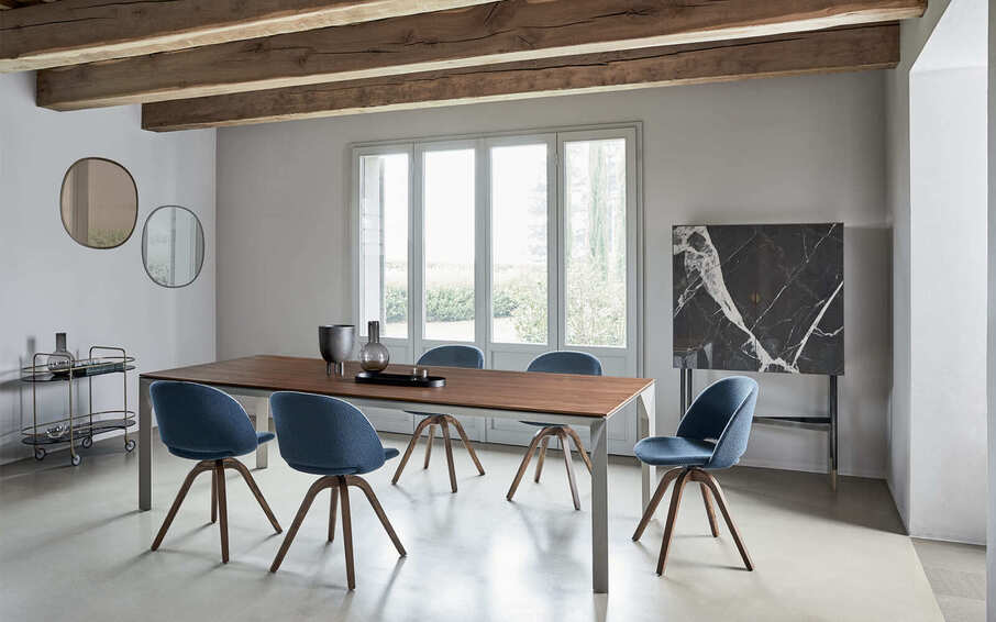 Неподвижный и раздвижной стол со структурой из лакированной стали. Столешница из хрусталя, суперкерамики или супермрамора. Доступен в квадратной и прямоугольной форме и в размерах: 159х75х159 160х75х90 190х75х100 250х75х100 160/225х75х90 190/265х75х100