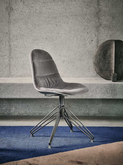Стул с подлокотниками или без них, поворотный или с колесами из лакированной стали или массива дерева. Корпус из полипропилена с обивкой и обшивкой спереди. Доступен в размерах: 47х57х83/49 47х57х84/49 60х60х84/49 61х57х83/48 61х60х83/48