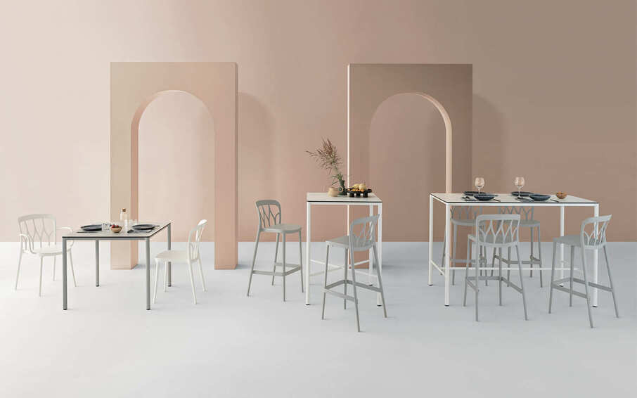 Высокий стол со структурой из лакированной стали. Столешница из меламина, многослойного материала, хрусталя, устойчивого к царапинам хрусталя, суперкерамики и супермрамора. Доступен в прямоугольной и квадратной форме и в размерах: 70х75х70 80х75х80 90х75х90 120х75х80 140х75х80 160х75х80
