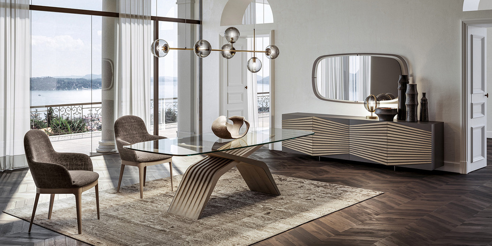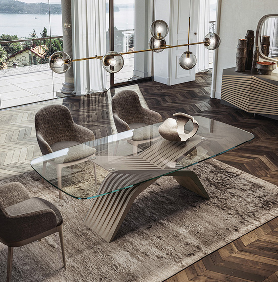 Чистые геометрические линии основания светло-серого ясеня дополняются табличка металлического цвета, которая дает решительное определение целый. Оригинальный дизайн создает привлекательное обращение, подчеркнутое стеклянной столешницей. Сочетание с Золотой стул создает восхитительное сочетание гладких поверхностей стола и изысканная обивка кресел. Таблица Nettuno представляет собой идеальный компаньон для Сервант Ray, декор которого перекликается с шаблон базы.