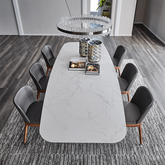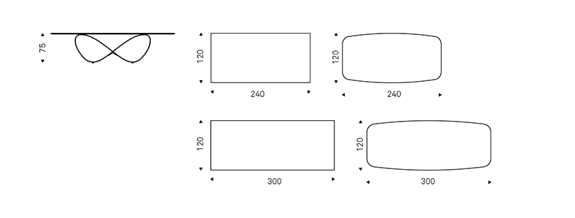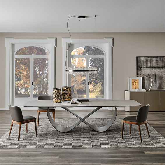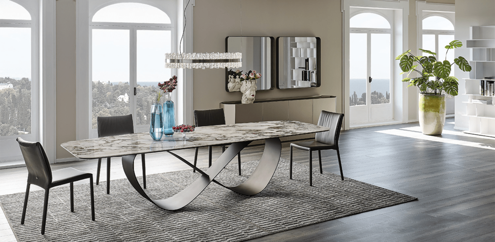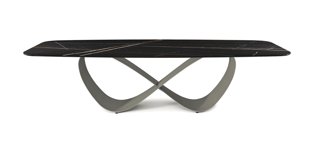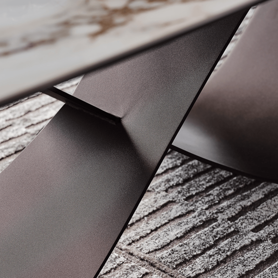 Стол с основанием из лакированной стали с тиснением из титана или бронзы, стали с матовым покрытием под бронзу или серая лакированная сталь. Столешница из керамики Marmi Alabastro, Supreme, Ardesia, матовый Golden Calacatta, глянцевый Golden Calacatta, матовый Portoro, глянцевый Portoro, глянцевый Sahara Noir, Emperador, Makalu, Breccia или Arenal. Доступен в размерах: 240x120x75h 240x120x75h 300x120x75h 300x120x75h