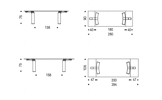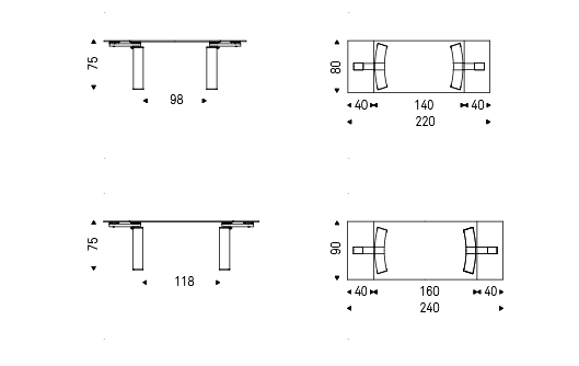 Раздвижной стол с ножками из полированной нержавеющей стали или ореха Каналетто. Столешница из закаленного прозрачного стекла или сверхпрозрачного стекла (середина 15 мм, дополнительные вставки 12 мм). Механизм из полированной нержавеющей стали. Доступен в размерах: 140 / 220x80x75h 160 / 240x90x75h 180 / 260x90x75h 200 / 294x106x75h