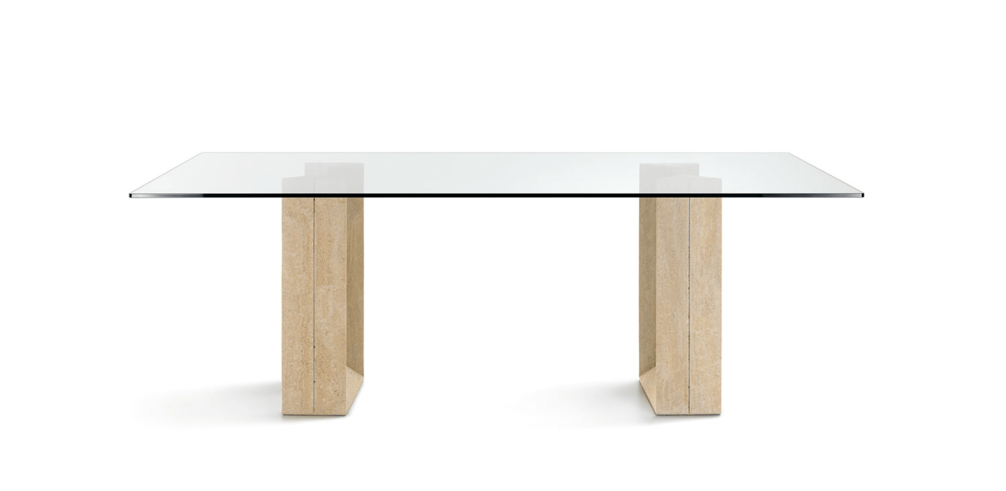 Стол с основанием из травертина или белого каррарского мрамора и столешницей из прозрачного стекла толщиной 15 мм. Доступен в прямоугольной, овальной и круглой форме и размерах: 200x100x72h 240x100x72h 220x100x72h 180x120x72h ø130x72h