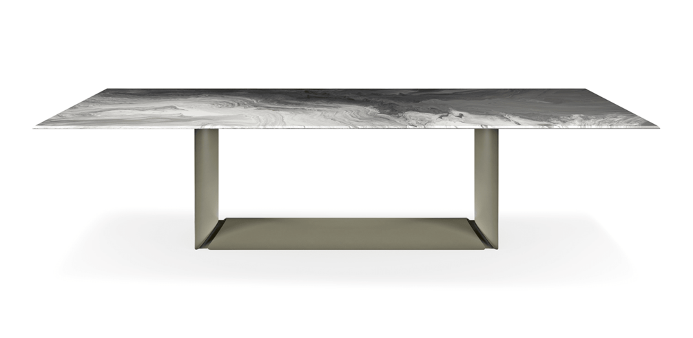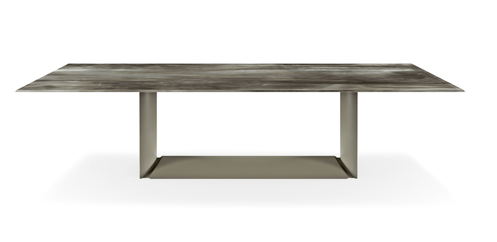 Стол с основанием из лакированной стали с тиснением под титан, бронзу, графит или черный цвет. Столешница толщиной 12 мм из сверхпрозрачного стекла с художественной декоративной печатью двух разных цветов. Доступен в прямоугольной форме и со скошенными краями и размерах: 200x100x73h 200x120x73h 240x120x73h 300x120x73h