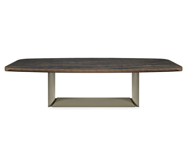 Стол с основанием из лакированной стали с тиснением под титан, бронзу, графит или черный цвет. Керамическая столешница толщиной 6 см для версии 300x128 и 5 см для версий 200x120 и 240x120. Стол представлен в прямоугольной форме и со скошенными краями в двух размерах: 200x120x75h 240x120x75,5ч 300x128x74h