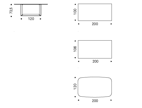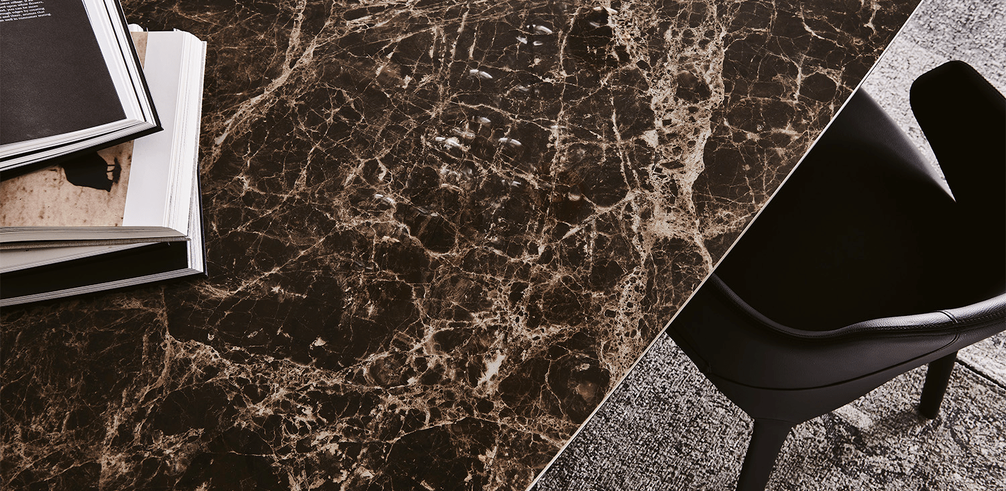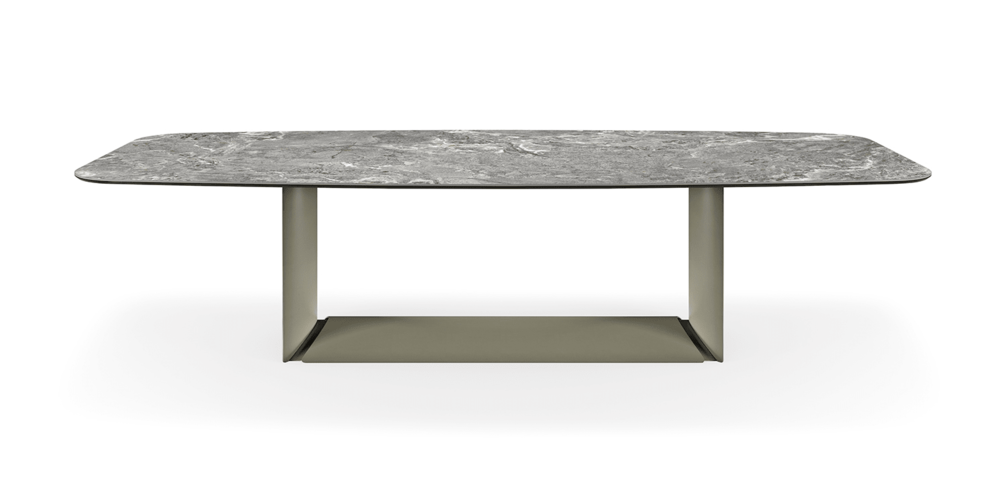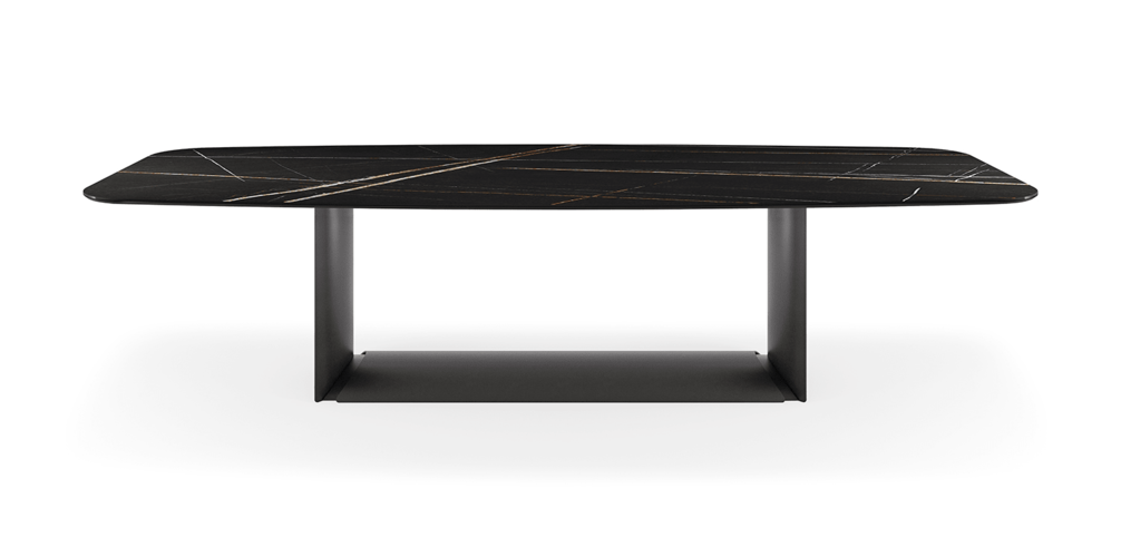 Стол с основанием из лакированной стали с тиснением под титан, бронзу, графит или черный цвет. Столешница из керамики Marmi Alabastro, Supreme, Ardesia, матовый Golden Calacatta, глянцевый Golden Calacatta, матовый Portoro, глянцевый Portoro, глянцевый Sahara Noir, Еmperador, Makalu, Breccia или Arenal Доступен в прямоугольной форме и со скошенными краями и в размерах: 200x100x73,5h 200x106x73,5 ч 200x120x73,5h 240x120x73,5h 240x120x73,5h 300x120x73,5h 300x120x73,5h 320x138x73,5h