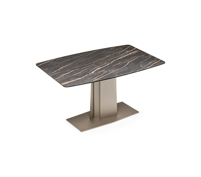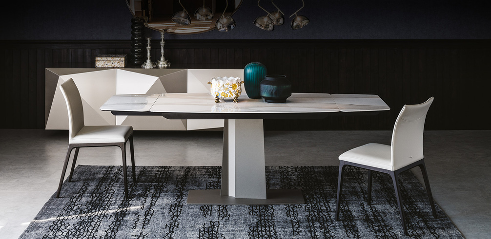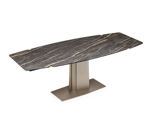 Раздвижной стол с основанием из стали с тиснением под титан, бронзу, графит или черный цвет. Столешница из керамики Marmi в цветах Alabastro, Supreme, Ardesia, матовая Golden Calacatta, глянцевая Golden Calacatta, матовая Portoro, глянцевая Portoro, глянцевая Sahara Noir, Makalu, Breccia или Arenal. Доступен в прямоугольной форме и со скошенными краями и в размерах: 140/217x90x75h; 160/237x92x75h.