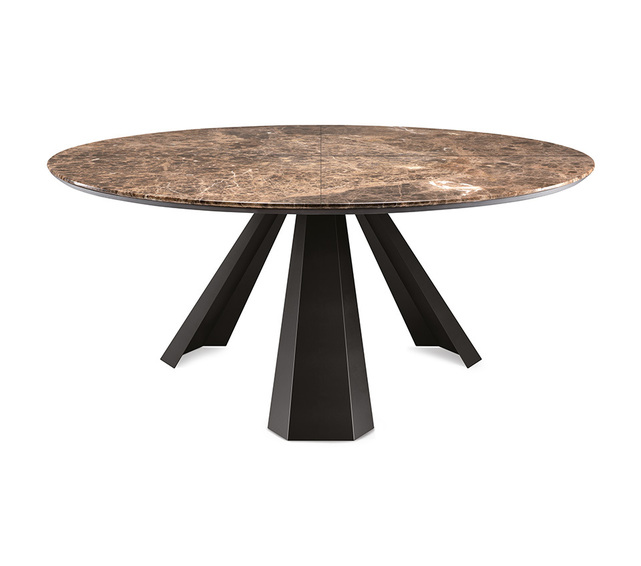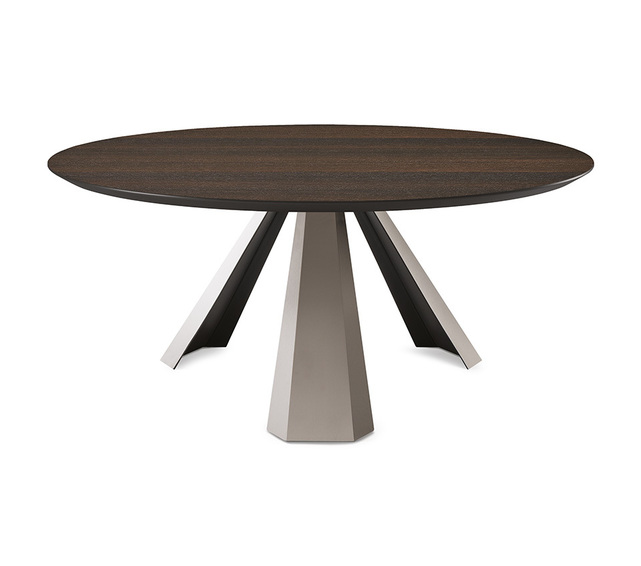 Круглый стол с основанием из лакированной стали с тиснением под титан, бронзу, графит или черный цвет. Столешница толщиной 15 мм сверхпрозрачного матового стекла, окрашенного в белый или графитовый цвет, или белого каррарского, мрамора Emperador, ореха Canaletto или обожженного дуба. Мраморные вершины состоят из четырех частей. Дополнительный центральный поворотный лоток Lazy Susan. Доступен в круглой форме и в размерах: ø160x75h ø180x75h