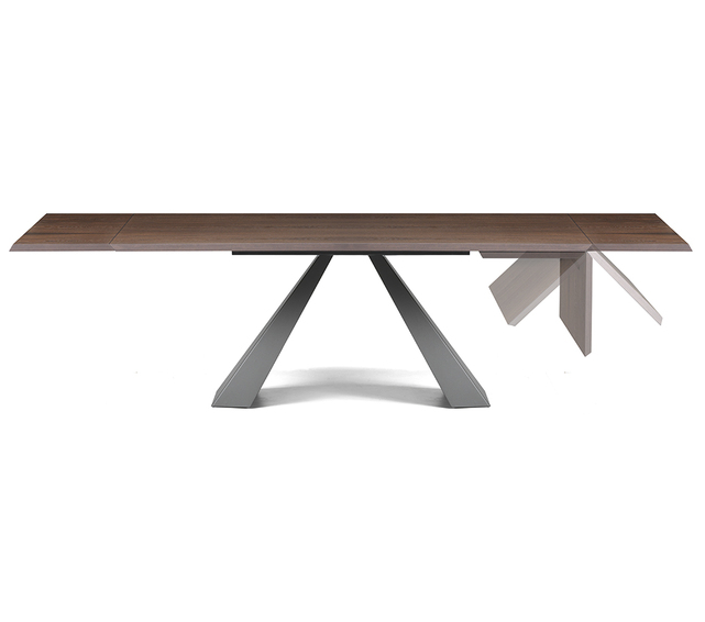 Раздвижной стол с основанием из лакированной стали с тиснением под титан, бронзу, графит, белый или черный цвет. Столешница и удлинители со скошенными краями из ореха Canaletto или обожженного дуба. Доступен в прямоугольной форме и в размерах: 140/217x90x75ч 160/237x90x75h 180/257x90x75h 200/277x100x75h 200/277x110x75h