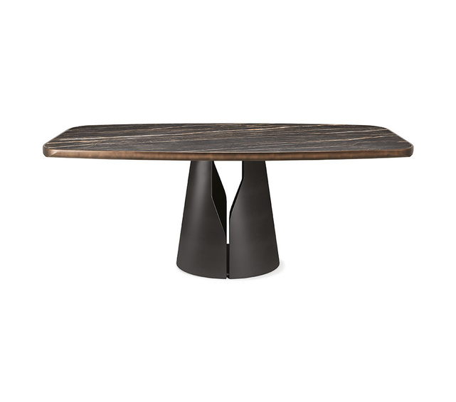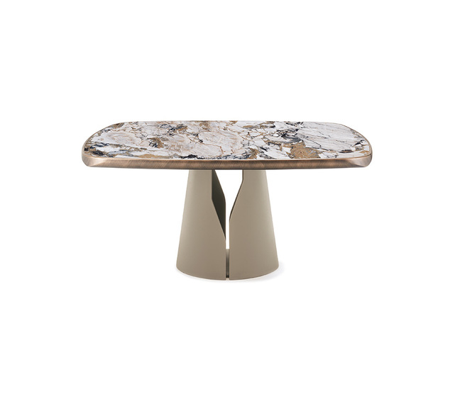 Cтол с основанием из стали с тиснением под титан, графит, белый или черный цвет. Версия со столешницей из керамики Marmi в цветах Alabastro, Supreme, Ardesia, матовая Golden Calacatta, глянцевая Golden Calacatta, матовая Portoro, глянцевая Portoro, глянцевая Sahara Noir, Makalu, Breccia или Arenal с лаковым покрытием матовой бронзы или матового серого цвета и закругленным нижним профилем. Толщина верха 6 см для версии 160x160 и 5 см для версий 200x120 и 240x120. Доступен в прямоугольной форме и в размерах: 160x160x74,5h 200x120x75h в форме 240x120x75h в форме