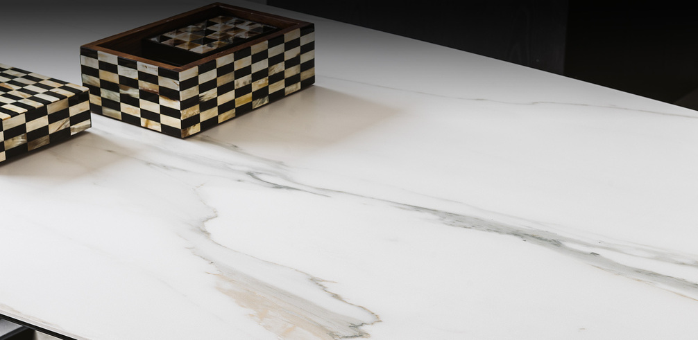 Cтол с основанием из стали с тиснением под титан, графит или белый цвет. Керамическая столешница толщиной 12 мм из матового золотистого цвета Calacatta. Доступен в прямоугольной форме и в размерах: ø158x75h 158x158x75h 240 x 120 x 75 ч 240x120x75h провис. 300x120x75h 300x120x75h провис.