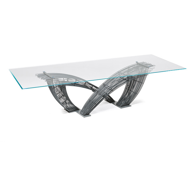 Cтол с основанием из прозрачной лакированной стали с тиснением под титан, графит, белый или черный цвет. Столешница из прозрачного, сверхпрозрачного или сверхпрозрачного стекла толщиной 15 мм со скошенными в обратную сторону краями. Верх укладывается на основу. Доступен в прямоугольной форме и в размерах: 240 x 120 x 75 ч 300x120x75h 300x120x75h провис. 320x120x75h
