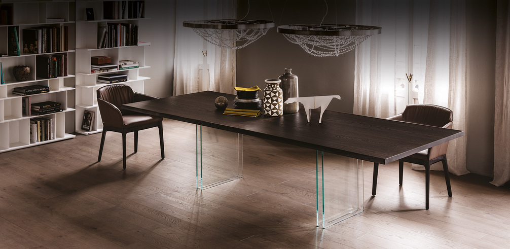 Cтол с основанием из сверхпрозрачного закаленного стекла толщиной 15 мм и балкой из графита. Столешница из ореха Canaletto, обожженного дуба или натурального дуба с неровными краями из массива дерева. Доступен также с балкой из ореха Canaletto, обожженного дуба или натурального дуба. Доступен в прямоугольной форме и в размерах: 200x100x75h 240x120x75h 300x120x75h