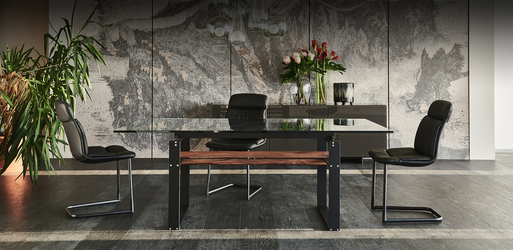 Стеклянный стол Jerez дополняет декор современной столовой в индустриальном стиле, выполненный из материалов премиум-класса.