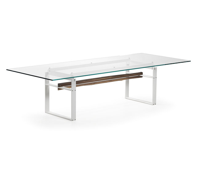 Cтол с основанием из лакированной стали и центральной балки из массива натурального ореха с тиснением под графит, белый или черный цвет . Версия со столешницей из прозрачного или сверхпрозрачного стекла толщиной 15 мм. Верх укладывается на основу. Доступен в прямоугольной форме и в размерах: ø140x75h 200x100x75h 240x100x75h 240x120x75h 240x120x75h провис. 300x100x75h 300x120x75h 300x120x75h провис.