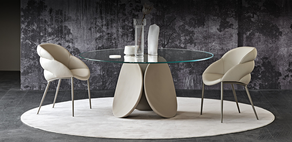 Стол с основанием из цементно-глиняного шпателя цветов Havana, Cairo или Oslo. Накрыто пластинами из прозрачного или экстрапрозрачного стекла толщиной 15 мм со скошенными краями. Доступен в круглой форме и в размерах: ø140x74h ø160x74h ø180x74h