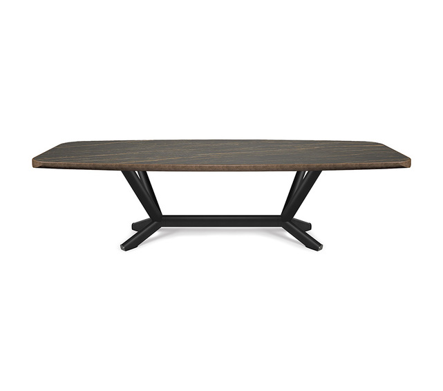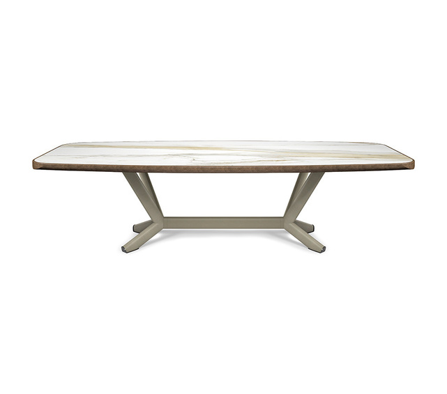 Cтол с основанием из стали с тиснением под титан, бронзу, графитовый или черный цвет матовой бронзы или матового серого цвета. Столешница из керамики Marmi Alabastro, Supreme, Ardesia, матовая Golden Calacatta, глянцевая Golden Calacatta, матовая Portoro, глянцевая Portoro, глянцевая Sahara Noir, Makalu, Breccia, Arenal с лаковым покрытием матовой бронзы или матового серого цвета и закругленным нижним профилем. Толщина верхней части 6 см для версий 160x160 и 300x128 и 5 см для версий 200x120 и 240x120. Доступен в прямоугольной форме и в размерах: 160x160x76,5h 200x120x75h 240 x 120 x 75h 300x128x76,5h