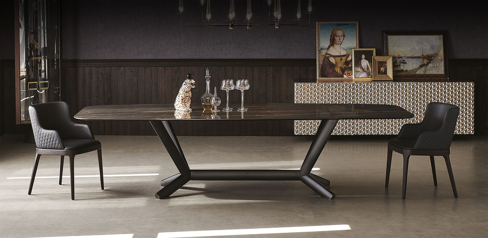 Cтол с основанием из стали с тиснением под титан, бронзу, графитовый или черный цвет матовой бронзы или матового серого цвета. Столешница из керамики Marmi Alabastro, Supreme, Ardesia, матовая Golden Calacatta, глянцевая Golden Calacatta, матовая Portoro, глянцевая Portoro, глянцевая Sahara Noir, Makalu, Breccia, Arenal, Corcovado или Kaindy. Доступен в прямоугольной форме и в размерах: 158x158x75h 200x100x75h 200x106x75h 200x120x75h 240x120x75h 240x120x75h 300x120x75h 300x120x75h 320x138x75h