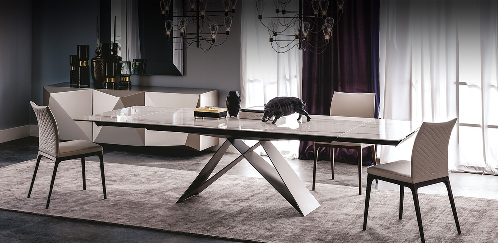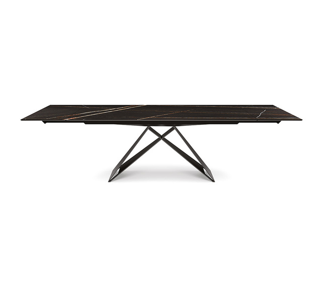 Раздвижной стол с основанием из лакированной стали с тиснением под титан, бронзу, графитовый или черный цвет. Столешница из керамики Marmi Alabastro, Supreme, Ardesia, матовая Golden Calacatta, глянцевая Golden Calacatta, матовая Portoro, глянцевая Portoro, глянцевая Sahara Noir, Makalu, Breccia, Arenal, Corcovado или Kaindy. Доступен в прямоугольной форме и в размерах: 160/236x90x75h 182/258x90x75h 200/294x100x75h 200/294x106x75h