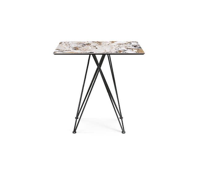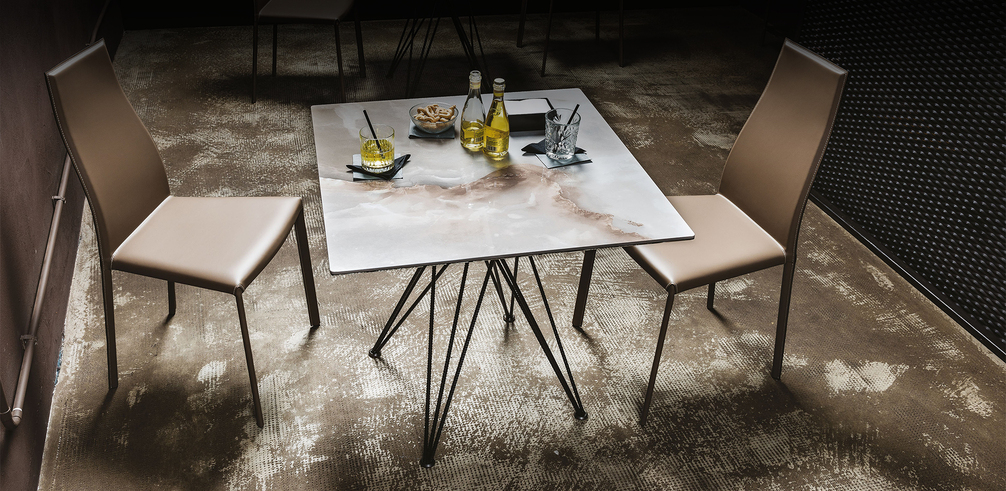 Cтол с основанием из лакированной стали с тиснением под графит, белый или черный цвет. Столешница из керамики Marmi Alabastro, Ardesia, Makalu или Arenal. Доступен в прямоугольной форме и в размерах: ø60x106h - А 60x60x106h - А ø60x76h - В 60x60x76h - В ø80x76h - В 80x80x76h - В ø100x76h - В