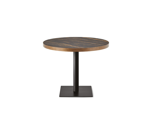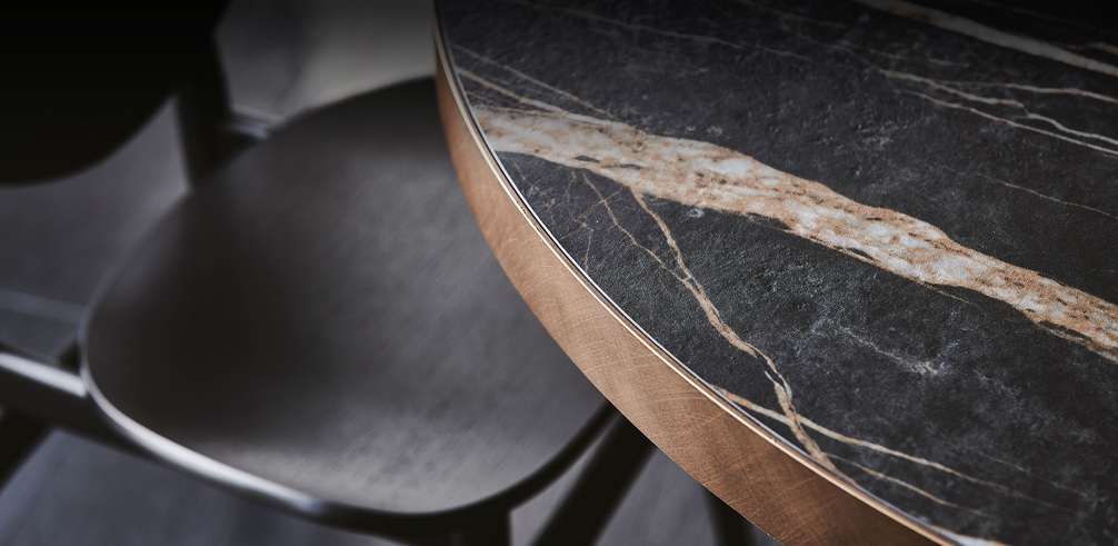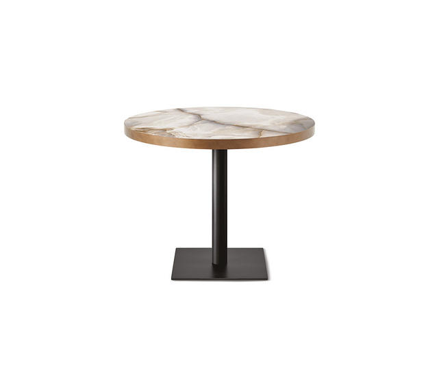 Cтол с основанием из лакированной стали с тиснением под титан, графит или черный цвет, а также верхней части из лакированной стали с тиснением титана, графита или черного или матовой бронзы. Столешница из керамики Marmi Alabastro, Ardesia, матовая Portoro, глянцевая Portoro, Makalu или Arenal. Доступен в прямоугольной форме и в размерах: ø60x105h - А ø79x75h - B ø99x75h - B
