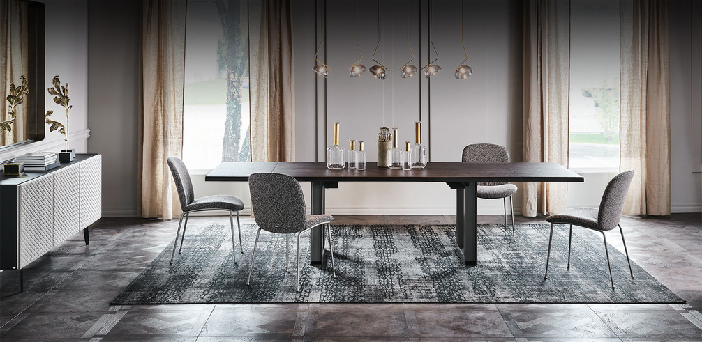 Раздвижной стол с основанием из лакированной стали. Столешница и надставки из ореха Canaletto, обожженного дуба или натурального дуба с массивными неровными краями. Доступен в прямоугольной форме и в размерах: 200/300x110x75h 240/340x120x75h