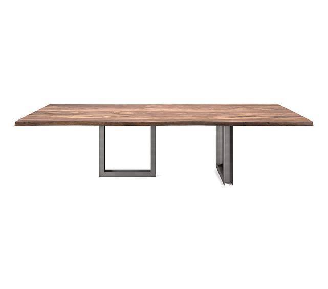 Cтол с основанием из прозрачной лакированной стали с тиснением под графит или белый цвет. Столешница из ореха Canaletto, обожженного дуба или натурального дуба с цельными неровными краями. Ноги можно ставить параллельно или перпендикулярно друг другу. Доступен в прямоугольной форме и в размерах: 200x100x75h - А 200x100x75h - В 240x120x75h – А 240x120x75h – В 300x120x75h - А 300x120x75h - В