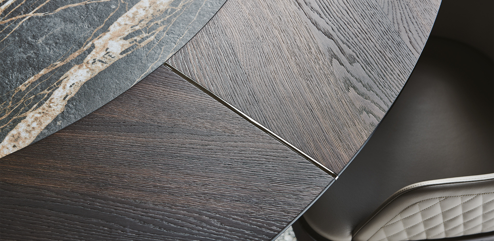 Cтол с основанием из лакированной стали с тиснением под титан, бронзу, графит, черный или белый цвет. Столешница из ореха Canaletto или обоженного дуба со вставкой из керамики Marmi Alabastro, Supreme, Ardesia, матовой Golden Calacatta, глянцевой Golden Calacatta, матовой Portoro, глянцевый Portoro, глянцевый Sahara Noir, Makalu, Breccia или Arenal. Детали из черного хрома. Версия «Т» с поворотной керамической вставкой. Доступен в круглой форме и в размерах: ø160x75h ø160x75h - Т ø180x75h ø180x75h - Т ø220x75h