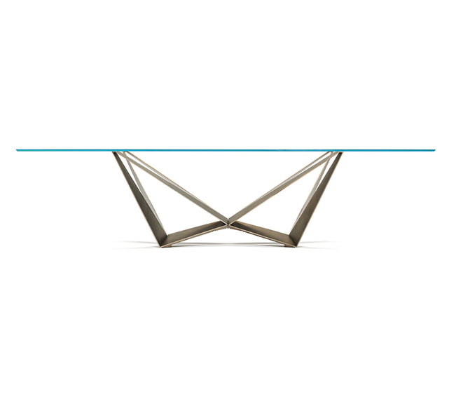 Cтол с основанием из лакированной стали с тиснением под титан, бронзу, графит, белый или черный цвет. Столешница из прозрачного, сверхпрозрачного или сверхпрозрачного стекла толщиной 15 мм со скошенными в обратную сторону краями. Стеклянный верх 12 мм на версиях 160x90, 182x90 и 200x106. Верх укладывается на основу. Доступен в прямоугольной форме и в размерах: 150x150x74h 160x90x74h 182x90x74h 200x100x74h 200x106x74h 200x120x74h 200x200x74h 240 x 100 x 74 h 240 x 120 x 74h 240x120x74h 300x100x74h 300x120x74h 300x120x74h