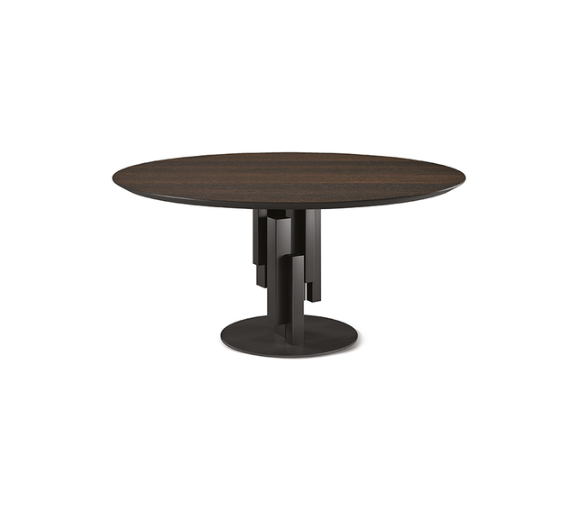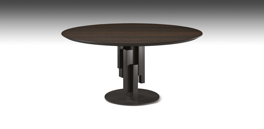 Cтол с основанием из лакированной стали с тиснением под титан, графит или черный цвет. Столешница из ореха Canaletto или обожженного дуба. Доступен в круглой форме и в размерах: ø140x75h ø160x75h