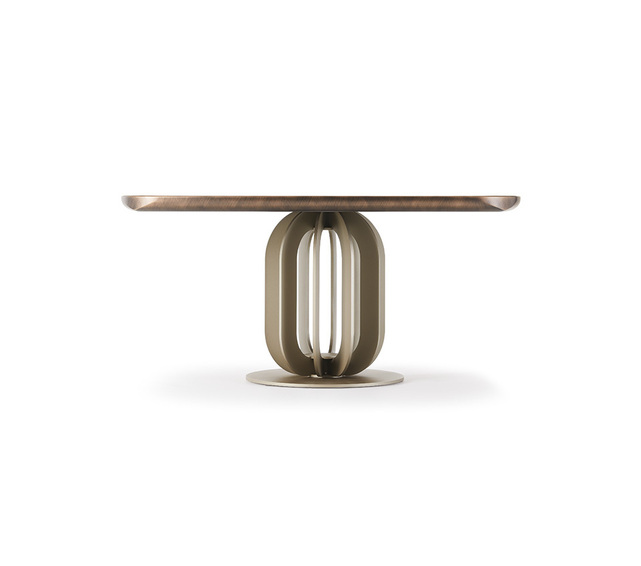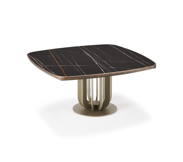 Cтол с основанием из лакированной стали с тиснением под титан, графит или черный цвет. Столешница из керамики Marmi Alabaster, Supreme, Ardesia, матовая Golden Calacatta, глянцевая Golden Calacatta, матовая Portoro, глянцевая Portoro, глянцевая Sahara Noir, Makalu, Breccia или Arenal с лаковым покрытием матовой бронзы или матового серого цвета и закругленным нижним профилем. Толщина верха 6 см. Доступен в квадратной форме и в размерах: 160x160x75h