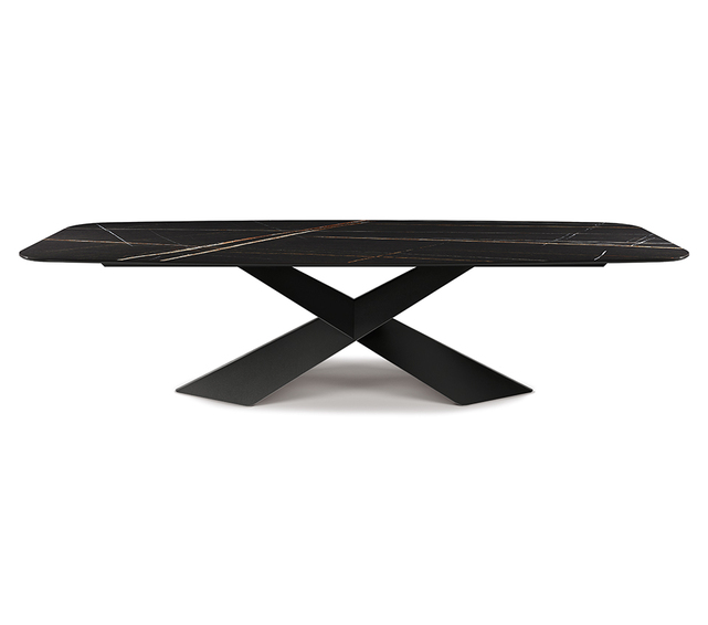 Cтол с основанием из лакированной стали с тиснением под титан, бронзу, графит или черный цвет матовой бронзы или матового серого цвета. Столешница из керамики Marmi Alabastro, Supreme, Ardesia, матовая Golden Calacatta, глянцевая Golden Calacatta, матовая Portoro, глянцевая Portoro, глянцевая Sahara Noir, Makalu, Breccia или Arenal, Corcovado или Kaindy. Доступен в прямоугольной форме и в размере: 200x100x74h 200x106x74h 200x120x74h 240 x 120 x 74h 240x120x74h 300x120x74h 300x120x74h