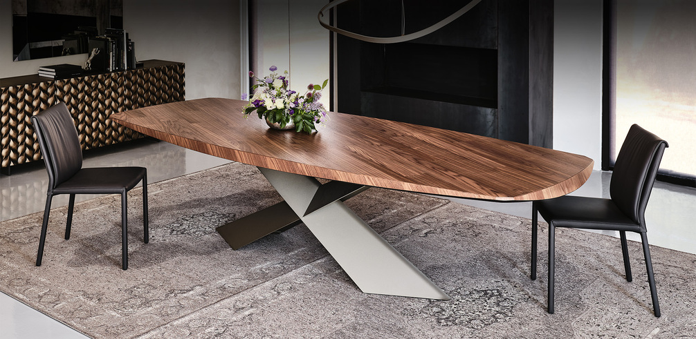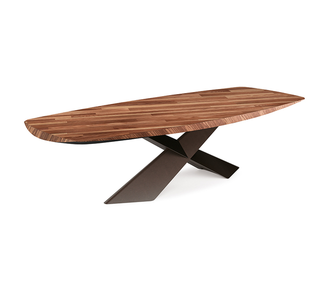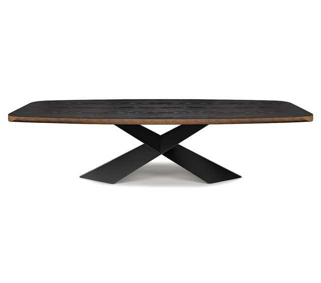 Cтол с основанием из лакированной стали с тиснением под титан, бронзу, графит или черный цвет матовой бронзы или матового серого цвета. Столешница версии "A": столешница со скошенными краями из ореха Canaletto, дуба Heritage, обожженного дуба или натурального дуба. Версия "B": столешница со скошенными краями из ореха Canaletto или обожженного дуба. Версия «C»: столешница из ореха Canaletto с лакированным матовым покрытием цвета Brushed Grey и закругленным нижним профилем или матовый черный вяз с открытыми порами с лакированным нижним профилем цвета Brushed Bronze и закругленным нижним профилем. Версия "S": столешница с неровными краями из массива ореха Canaletto, обожженного дуба или натурального дуба. Версия «Masterwood»: столешница в форме лодки из ореха Canaletto или Burned Oak из диагональных деревянных досок разного размера. Столешница имеет наклонные и закругленные края. Доступен в прямоугольной форме и в размерах: 200x100x75h 200x120x75h 200x120x76h 240x120x75h 240x120x76h 250x128x74h 250x128x75h 250x128x76h 300x120x75,5h 300x120x75h 300x128x73,5h 300x128x74,5h 300x128x76h