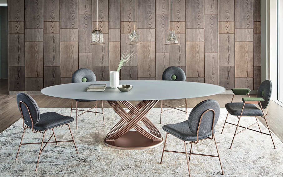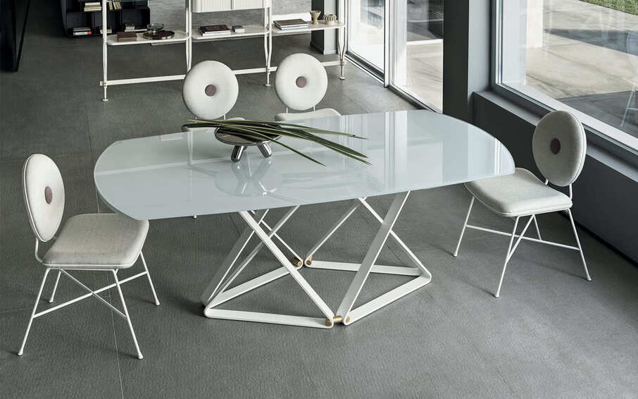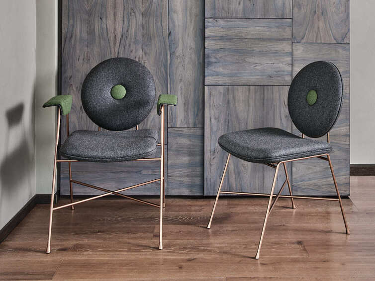 Стул с подлокотниками или без них, конструкция из лакированной стали, с мягкой обивкой. Доступен в размерах: 46х60х86/47 66х61х86/47