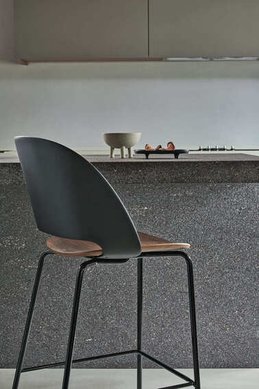 Низкий табурет со структурой из лакированной стали, спинкой из полипропилена и сиденьем из дерева или с обивкой из экологической кожи, экологической кожи премиум-класса, технического бархата, ткани Mambo, ткани Lulù, водонепроницаемого нубука, водонепроницаемого нубука с принтом, чистой шерсти, бархата, ткани Decò, ткань Kvadrat fiel, ткань для хвоста Kvadrat и кожа Premium
