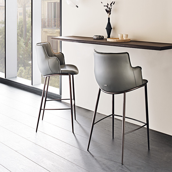 Табурет с рамой из лакированной стали с тиснением из титана, бронзы, графита, жемчуга или черного цвета. Обложка из ткани, синтетического нубука, микронубука, мягкой кожи или синтетической кожи в соответствии с картой образцов. Крышка не съемная. Представлен в размерах: 54x58x100H 54x58x110H