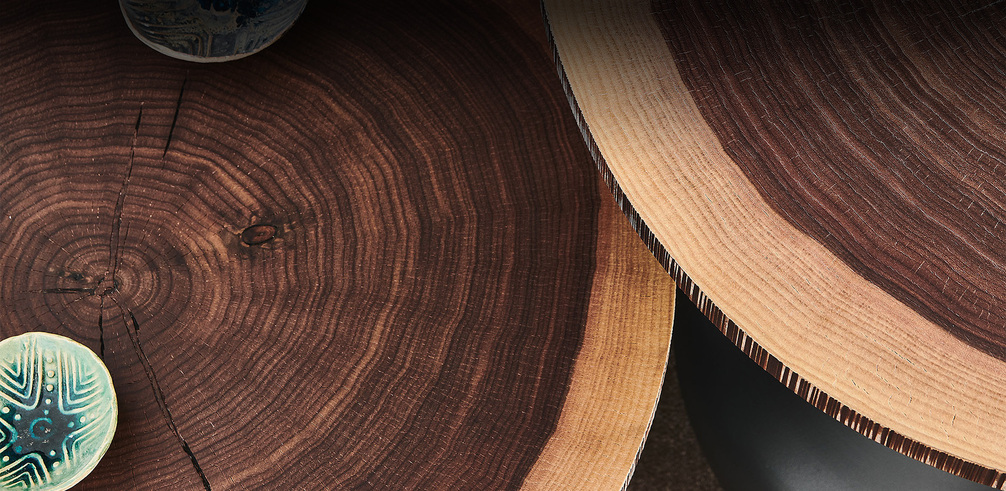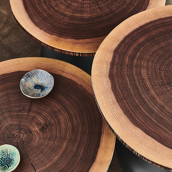 Журнальный столик с основанием из лакированного графитового или белого тисненого алюминия. Столешница шпонированная МДФ в бревенчатом срезе ствола орехового дерева. Примерные размеры топа, каждое изделие уникально и отличается по форме и размеру. Доступен в размерах: ~50X60X35h ~50X60X42h ~50X60X50h