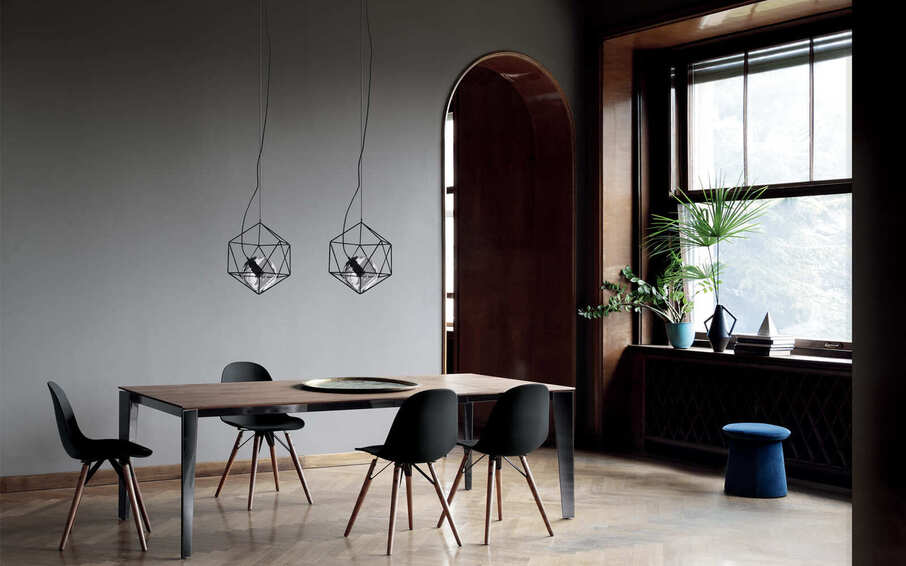 Раздвижной стол со структурой из лакированной стали. Декоративные вставки ножек и столешницы из шпона, хрусталя, устойчивого к царапинам хрусталя, суперкерамики, супермрамора. Доступен в прямоугольной форме и в размерах: 140/180/220x75x90 160/210/260x75x90 190/240/290x75x100