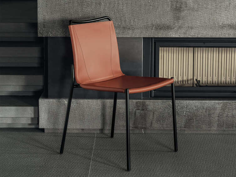 Стул с подлокотниками или без них, каркас из лакированной стали. Мягкий и обтянутый кожаным монококом. Доступен в размерах: 52х57х85х47 58х57х85х47