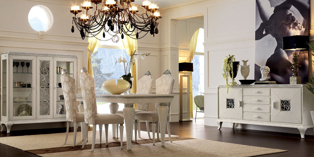 Застекление белой отделки придает освещенность всей гостиной, подчеркивая утонченность каждого предмета, от трехдверного шкафа до буфета. Изогнутая линия ножек с отчетливо неоклассическим оттенком является общим знаменателем этой коллекции, наряду с уникальным мотивом, украшающим стеклянные двери.