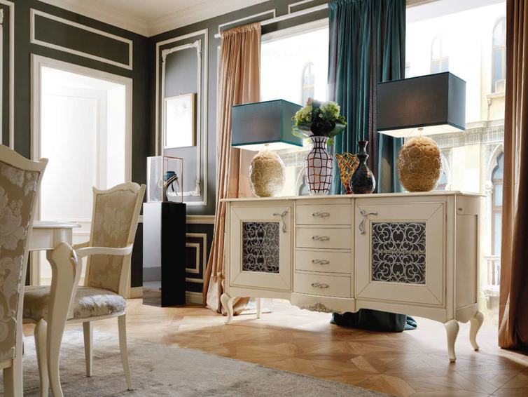 Идеальный формальный баланс и тонкие цветовые сочетания лежат в основе наилучших эстетических результатов для гостиной. Сервант с четырьмя ящиками посередине имеет ту же отделку, что и стулья, расставленные вокруг овального стола, с гладкими коническими ножками. Строгий, но изысканный стул во главе стола становится еще более изысканным благодаря превосходной цветочной обивке основания и спинки сиденья.