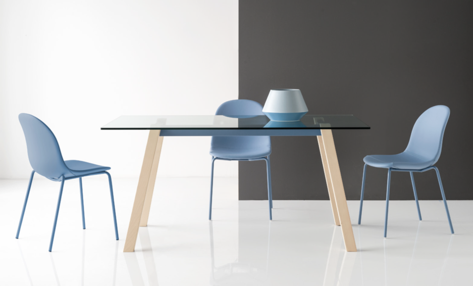 Стол с деревянными ножками, окрашенной деревянной перекладиной и стеклянной столешницей. T-Table сочетает в себе обычные элементы с оригинальными и красочными.