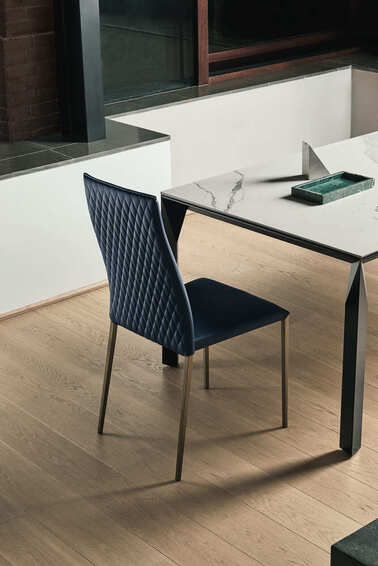 Стул с гибкой и эргономичной спинкой, каркас из лакированной или хромированной стали, с мягкой подкладкой и обивкой, а также стул и каркас из лакированной стали с алюминиевым покрытием. Корпус обтянут экокожей, экокожей премиум-класса, техническим бархатом, тканью Mambo, тканью Lulù, водонепроницаемым нубуком, водонепроницаемым нубуком с принтом, чистой девственной шерстью, бархатом, тканью деко и кожей премиум-класса. Также доступна версия со стеганой спинкой (только в обивке из водонепроницаемого нубука, экокожи и кожи премиум-класса). Доступен в размерах: 46х58х99/46