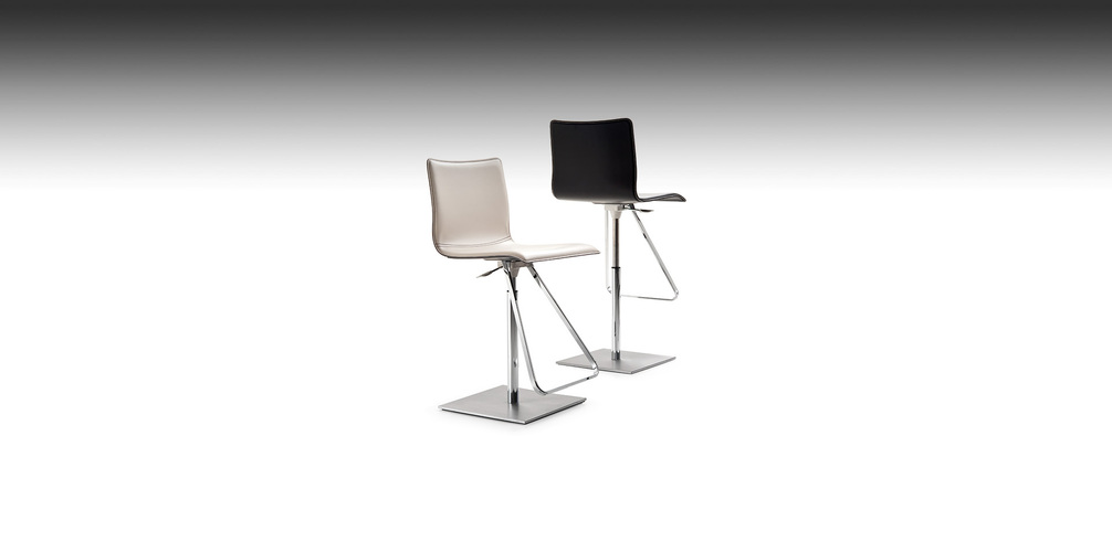 Поворотный и регулируемый по высоте табурет с основанием и стойкой из сатинированной нержавеющей стали, опорой для ног и газовым поршнем из хромированной стали или с основанием, опорой и опорой для ног из черной лакированной стали и газовым поршнем из хромированной стали. Сиденье обтянуто кожей согласно карточке образца. Доступен с круглым основанием по запросу. Стандартная или контрастная строчка. Представлен в размере: 44x48x87/113h
