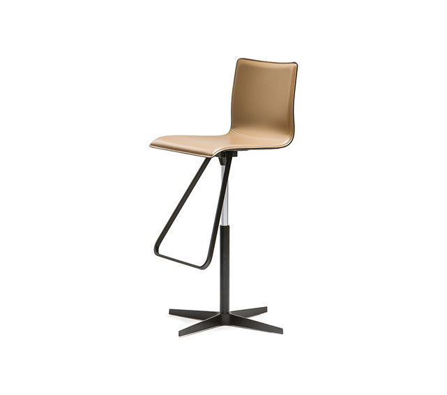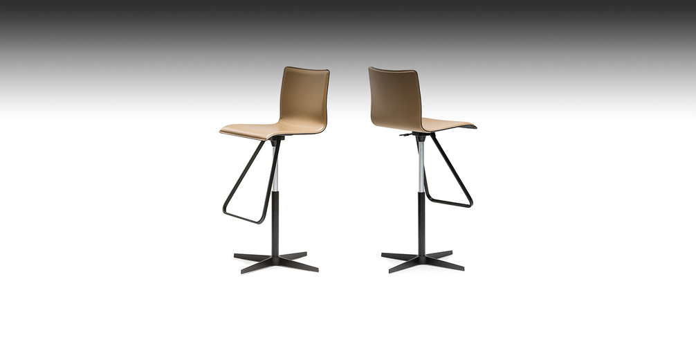 Поворотный сверхлегкий табурет, регулируемый по высоте, с основанием из 4 спиц из полированного алюминия и колонной, подставкой для ног и газовым поршнем из хромированной стали или с опорной плитой, колонной и подставкой для ног из черной или титановой тисненой лакированной стали и газовый поршень из хромированной стали. Каркас обтянут кожей согласно образцу карты. Стандартная или контрастная строчка. Представлен в размере: 44x48x85/110h