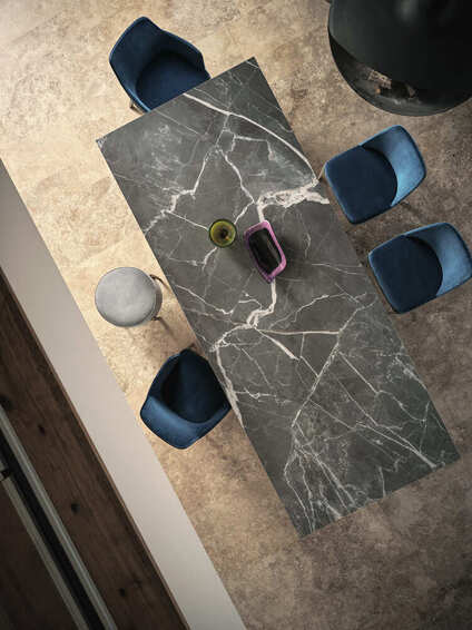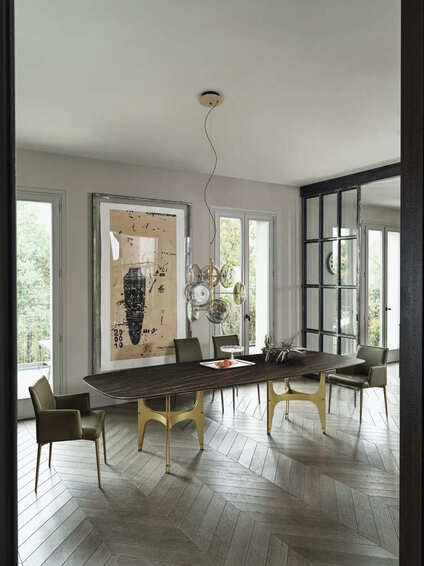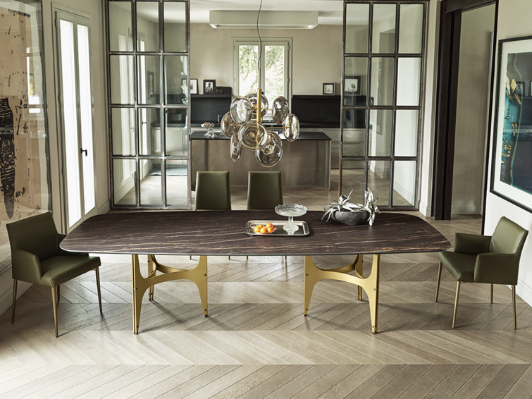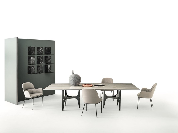 Неподвижный стол со структурой и декоративными деталями из лакированной стали, столешницей из массива дерева или супермрамора