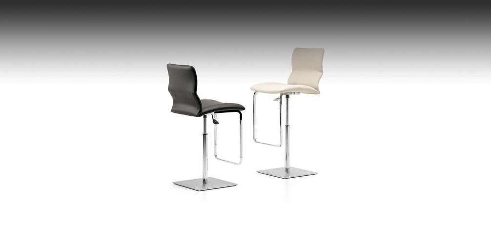 Поворотный табурет, регулируемый по высоте, с основанием и стойкой из сатинированной нержавеющей стали, опорой для ног и газовым поршнем из хромированной стали или с основанием, опорой и опорой для ног из черной лакированной стали и газовым поршнем из хромированной стали. Сиденье обтянуто тканью, синтетическим нубуком, микронубуком, синтетической кожей или мягкой кожей в соответствии с картой образцов. Круглое основание по запросу. Представлен в размере: 54x45x89/115h