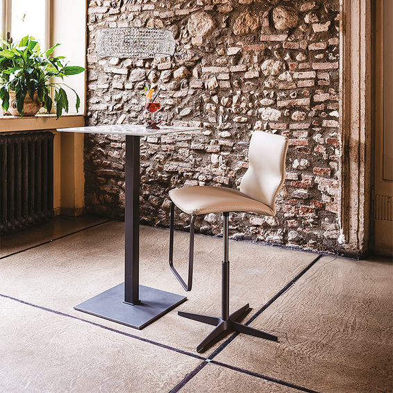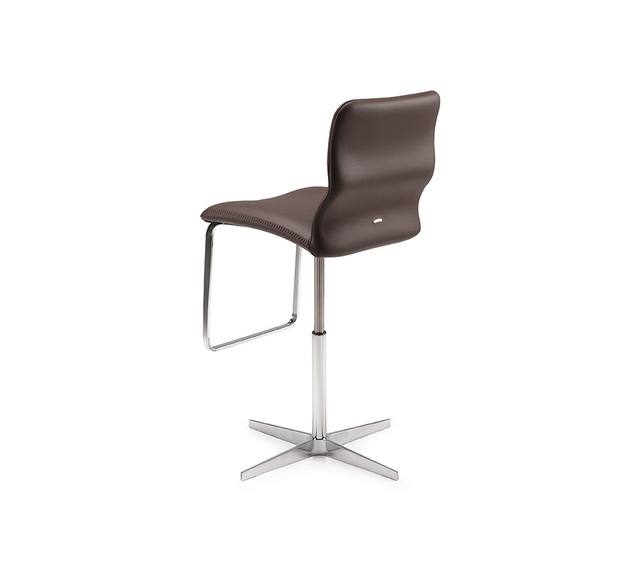 Поворотный сверхлегкий табурет, регулируемый по высоте, с основанием из 4 спиц из полированного алюминия и колонной, подставкой для ног и газовым поршнем из хромированной стали или с опорной плитой, колонной и подставкой для ног из черной или титановой тисненой лакированной стали и газовый поршень из хромированной стали. Каркас покрыт тканью, синтетическим нубуком, микронубуком, синтетической кожей или мягкой кожей в соответствии с картой образцов. Опущенный поршень позволяет использовать табуретку в качестве стула. Представлен в размере: 54x45x80/105