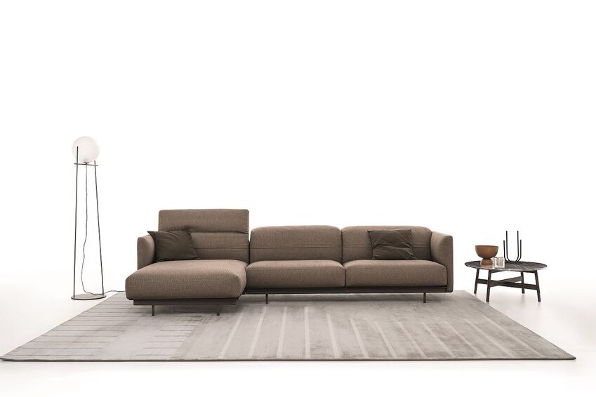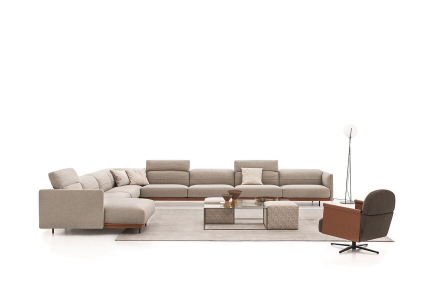 Выраженная горизонтальная структура дивана ненавязчиво подчеркнута изящными подлокотниками, которые являются отличительной особенностью модели в различных вариантах и конфигурациях